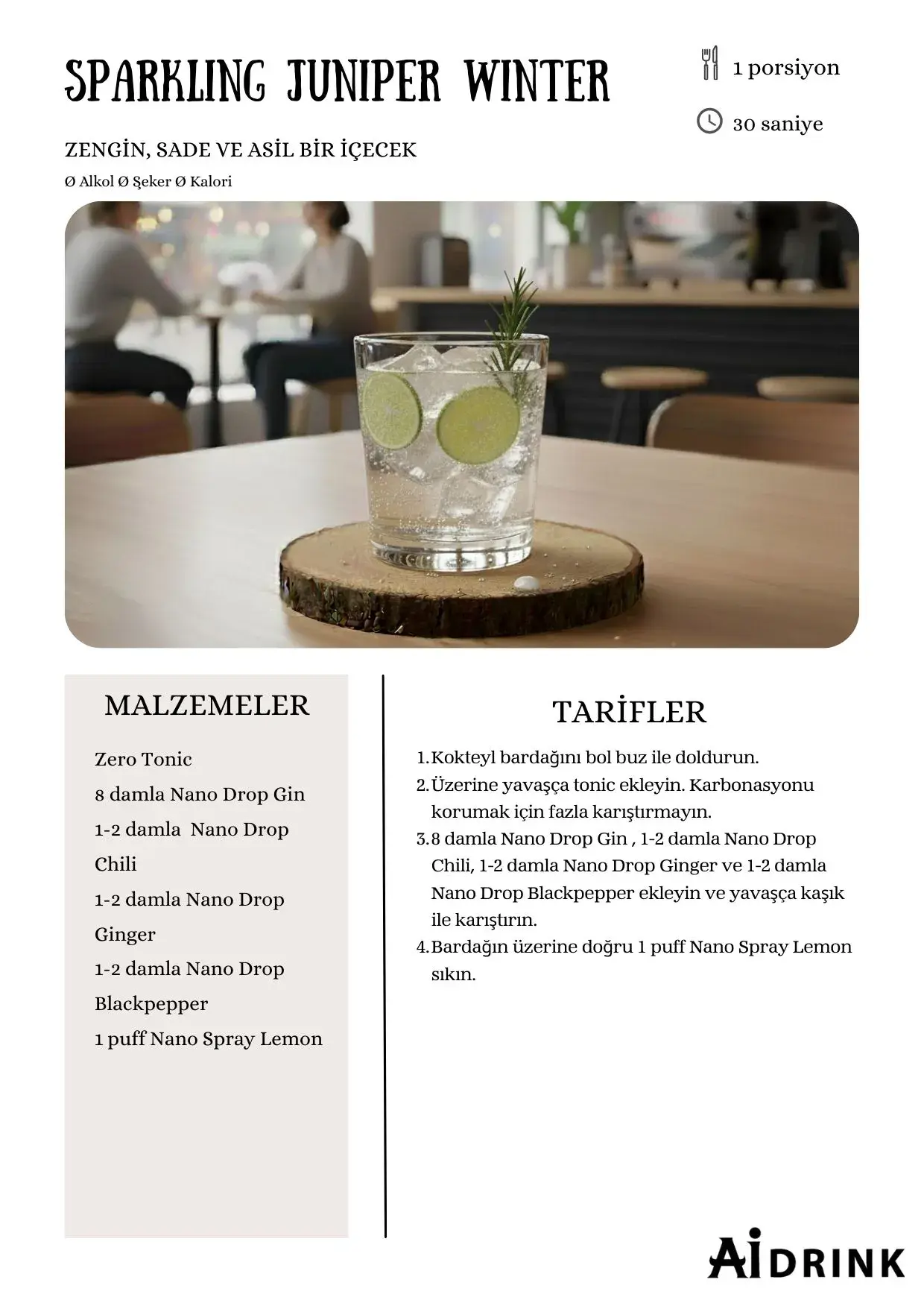 Bu kokteyl içime hazır bir şekilde tasarlanmıştır. Direkt buz ile karıştırıp tüketebilirsiniz. Aynı zamanda 1:3 oranında başka bazlar ile karıştırarak da yeni kokteyller hazırlayabilirsiniz. Örneğin 90 mL kokteyl karışımını, 30 mL spirit (alkolsüz Cin gibi) karıştırıp, derin tat profiline sahip, zevkinize göre kokteyller hazırlayabilirsiniz.